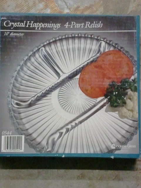 Vintage 1940’s Indiana Crystal 4 Part Relish Plate. Versatile as aΒ relish dish or divided serving platter wouldΒ look wonderful serving your veggies, fruit, desserts, appetizers or whatever else youΒ desire. MeasuringΒ 10″ in diameter, it has plenty of capacity to serve upΒ your goodies in style. A great additionΒ to your Glass/ Indiana Collection!