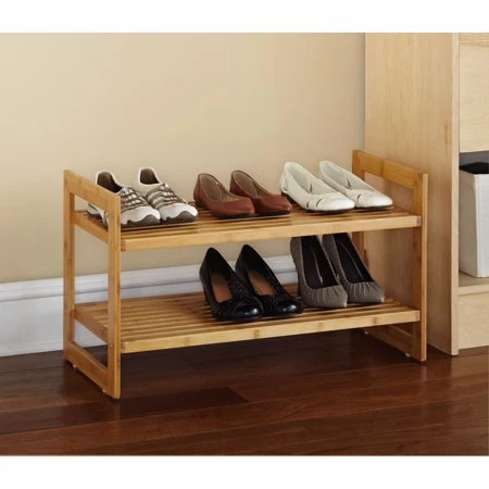 Mainstays 2-Tier Shoe Shelf will help streamline you and your family’s daily routine, and take the guesswork out of dressing. This ingenious little piece of furniture will help you minimize time searching for your favorite pair of footwear and never loose a lone shoe again. This wood shoe shelf can be stowed in your mudroom or coat closet to help reduce mud and dirt that shoes inevitably drag indoors. Place it at the bottom of your clothing closet to expand your storage area.Β