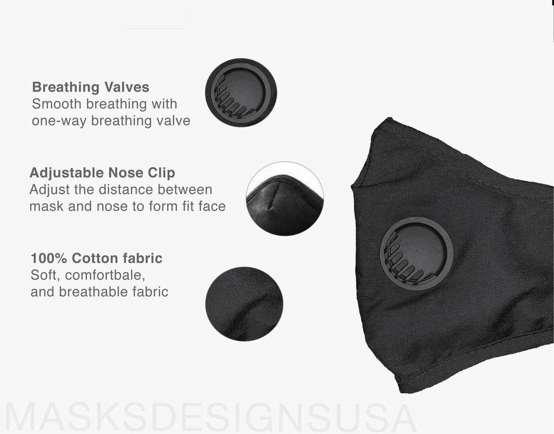 Face maskΒ is washable and made of cotton with breathing vent and filter pocket. Unisex with adjustable nose clip.Β