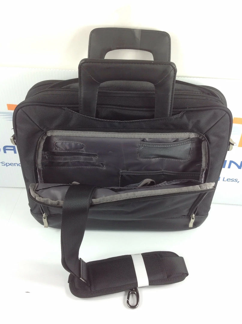 Looking for support for your laptop? This is a well made with great functionality bag that fits a 14β laptop. Made of black nylon. Adjustable strap. Includes many pockets front and back with two large pockets for papers, books and a cushioned pocket for your laptop.Β