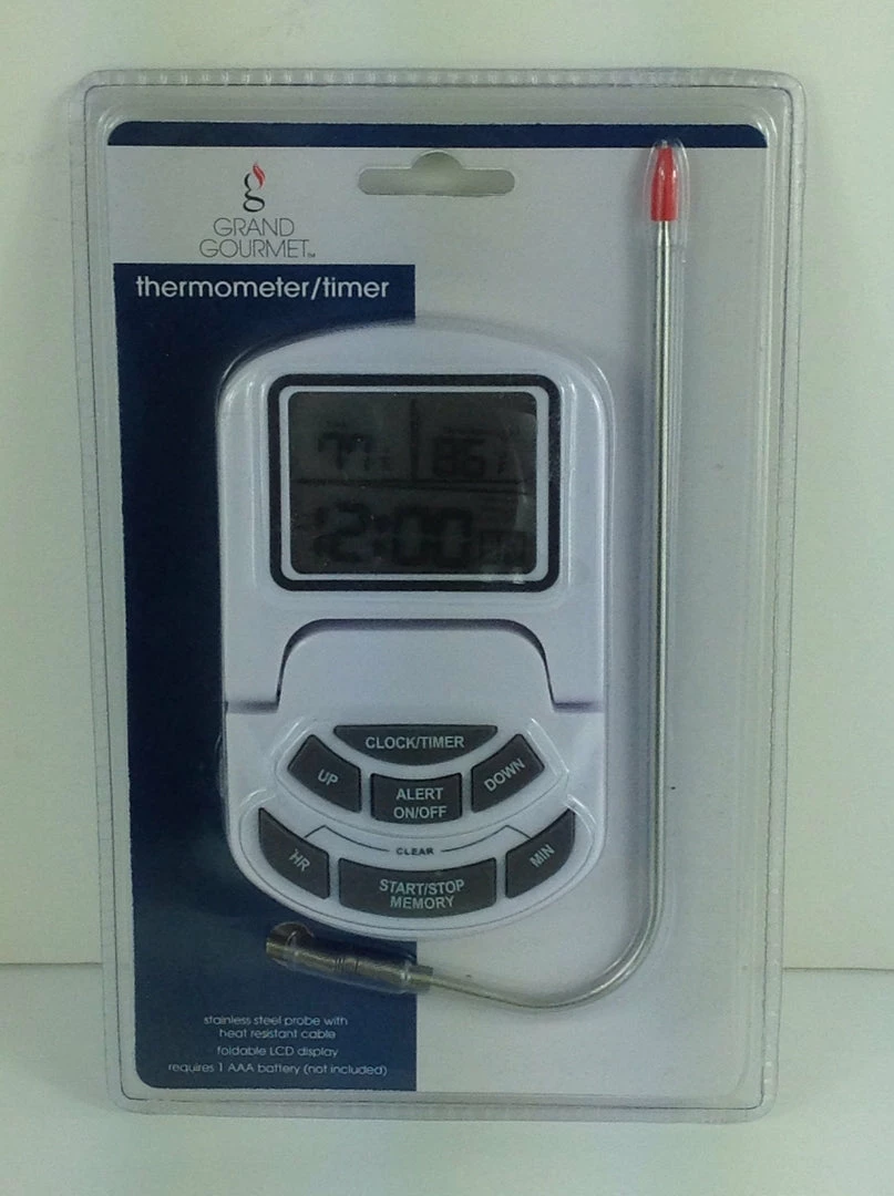 Kitchen BBQ Grill Meat Oven Cooking Thermometer/timerΒ . Grand Gourmet Thermometer / Timer Stainless steel probe with heat resistant cable Requires AAA battery (not included) Brand New Open to questions ThanksFor the buyer security and seller security, every item sold will be packaged. 5.5 x 8.6 x 1