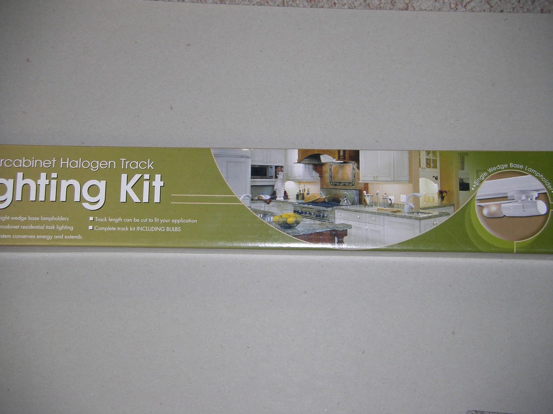 Under cabinet halogen track lighting kit.12-Light White Single Wedge Base Lampholder Kit. Includes twelve lampholders with 5W T3.25 lamps, one section of track (32 3/16″ actual length), one plug in style electronic power supply with on-off switch, lamps and all necessary hardware in an attractive full color display package.
