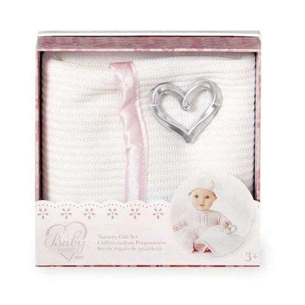 The You & Me Baby So Sweet Knit Doll Blanket with Rattle Nursey Gift Set pairs with a Baby So Sweet doll. It includes a soft, white blanket with a pink trim and a silver heart emblem, as well as a rattle that the baby doll can hold. These You & Me Baby So Sweet Accessories add more realistic elements to a toy baby set. Baby So Sweet dolls wrap comfortably in the soft blanket and hold the rattle for realistic play.