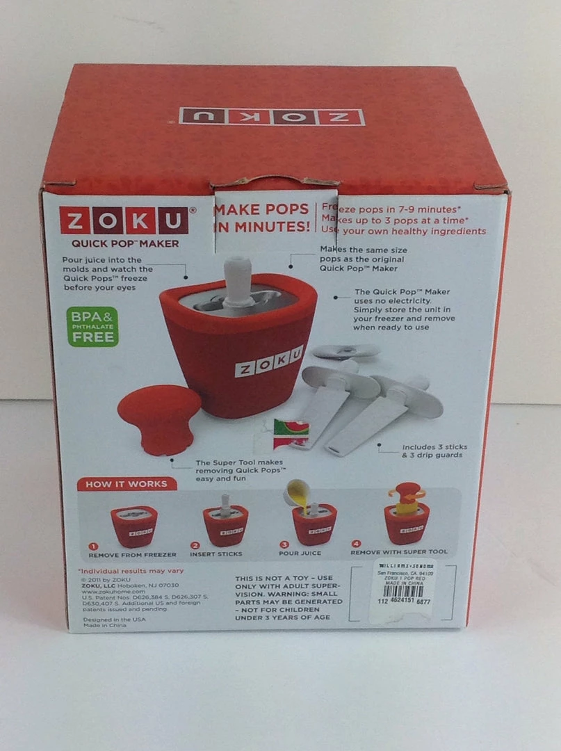 At last! A personal quick pop maker from Zoku! Keep it in the freezer until ready to use; then pour in chilled fruit juice of your choice, wait 7 minutes (watching it magically freeze is fun), and enjoy! Just like the original Quick Pop Maker, the Zoku Single makes up to three pops before refreezing the unit! Includes 3 durable pop sticks, 3 drip guards, and a super tool to release pops from molds.